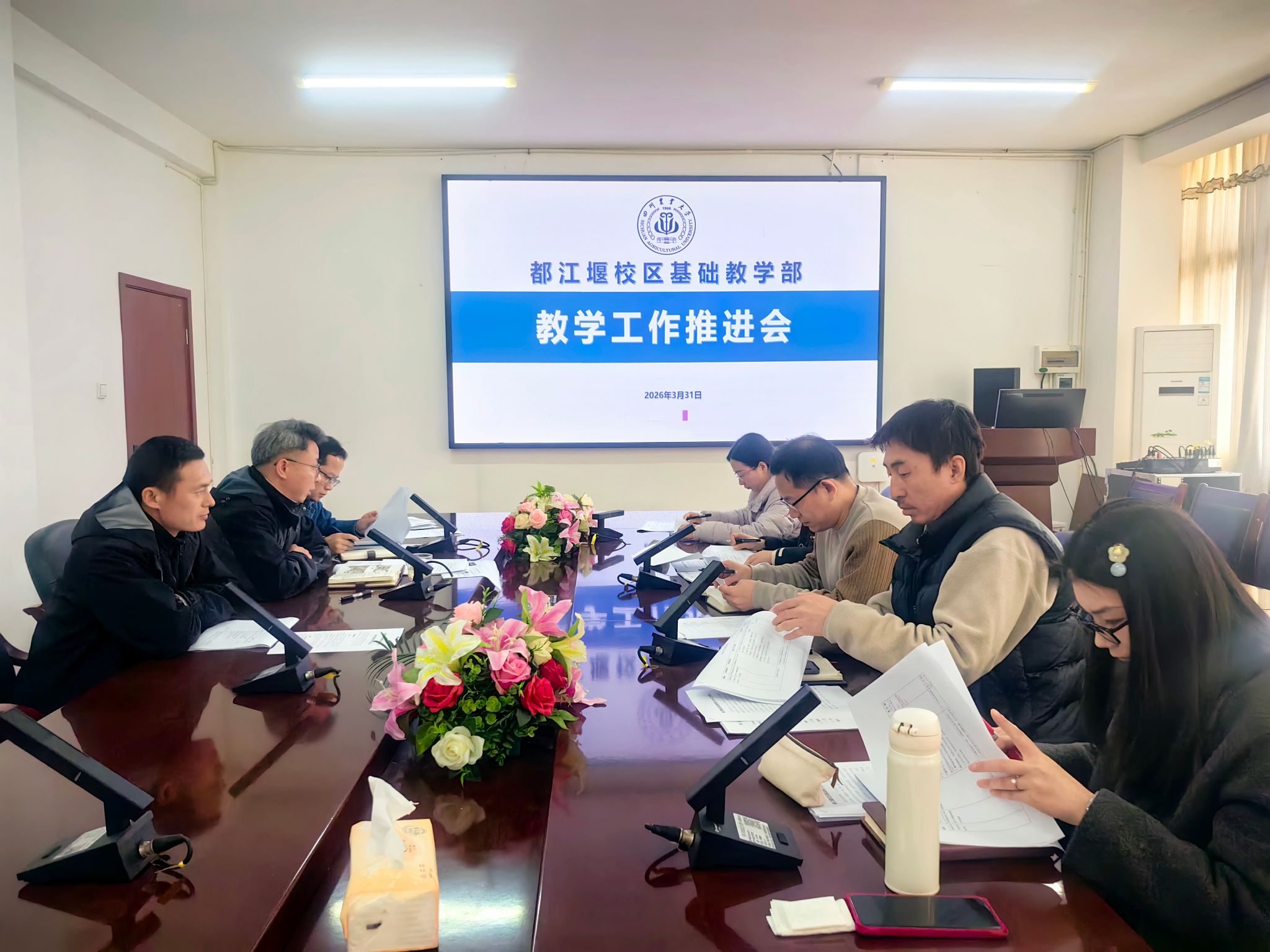 3月31日上午,都江堰校区基础教学部在4202召开教学工作会,部署教学管理重点任务,推进教学质量提升等各项工作。基础教学部领导班子、办公室及各系部负责人参会。
