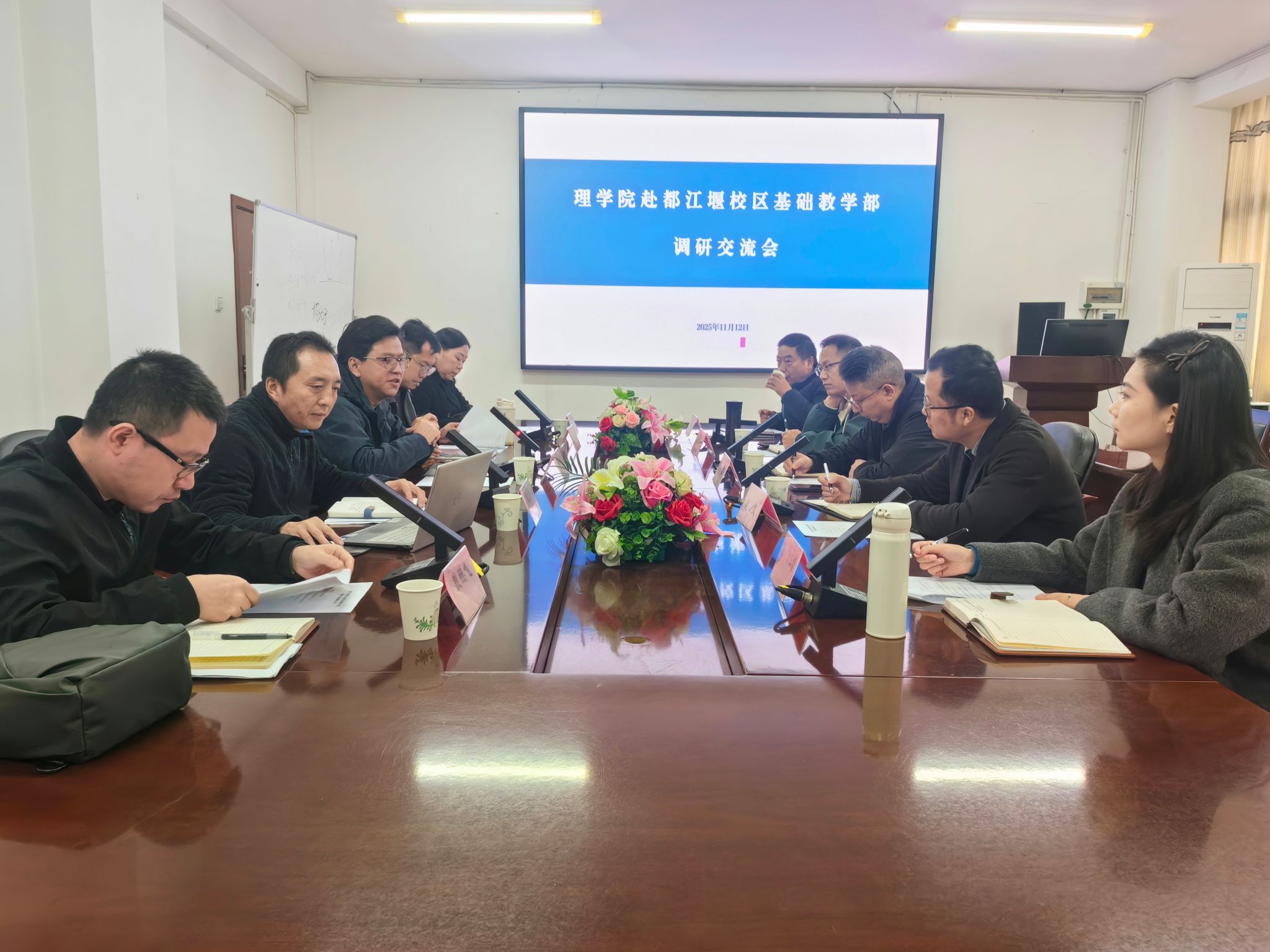 11月12日,理学院院长吴贺君一行到都江堰校区基础教学部开展调研交流,基础教学部主任刘诚、副主任赵文以及数理教学部的相关老师参会。