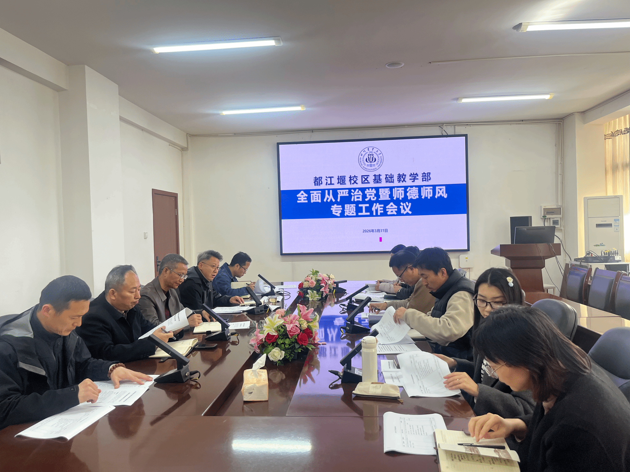 3月31日,基础教学部在4202召开从严治党暨师德师风专题工作会议,校区综管办党委书记陈文华、纪委书记秦之香、基础教学部党支部书记刘诚以及支委、支部党小组成员、系部负责人到会。